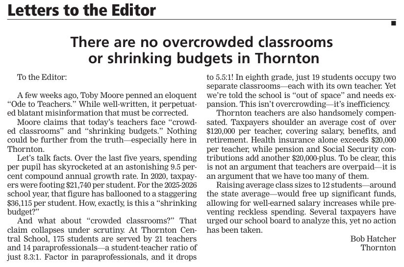Letter to the Editor regarding school class sizes and budgets in Thornton NH by RVHMaster | Aug 11, 2025 | Uncategorized | 0 comments This was published in the Plymouth Record Enterprise on July 3, 2025 Print đź–¨ PDF đź“„ Submit a Comment Cancel replyYour email address will not be published. Required fields are marked *Comment * Name * Email * Website Save my name, email, and website in this browser for the next time I comment. Δ